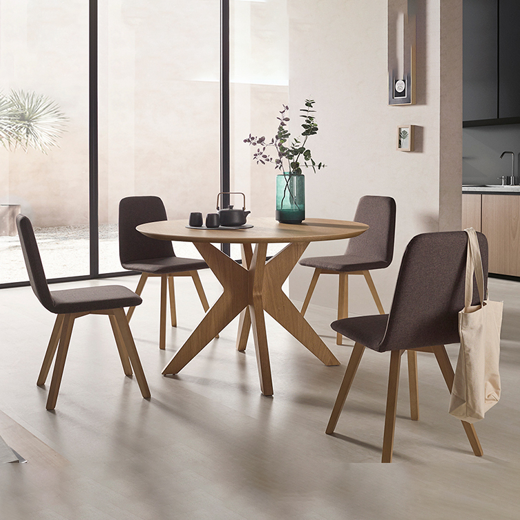 El diseño se completa con unas patas en forma de cruz en roble natural, que garantizan estabilidad y un estilo atemporal. Bajo pedido, también se puede fabricar en otros acabados, lacados o pulimentados, para adaptarse a distintos estilos de interiorismo.